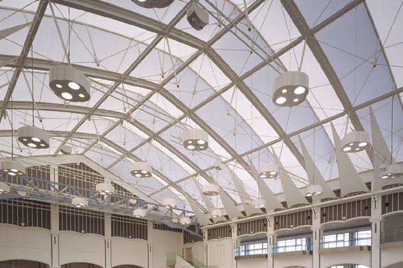 第二种是索支撑式结构,它通过张拉索和支撑杆来支撑整个屋顶,具有轻巧、美观、简洁等优点。这种结构非常适合大跨度建筑,如比利时安特卫普港口新大楼。