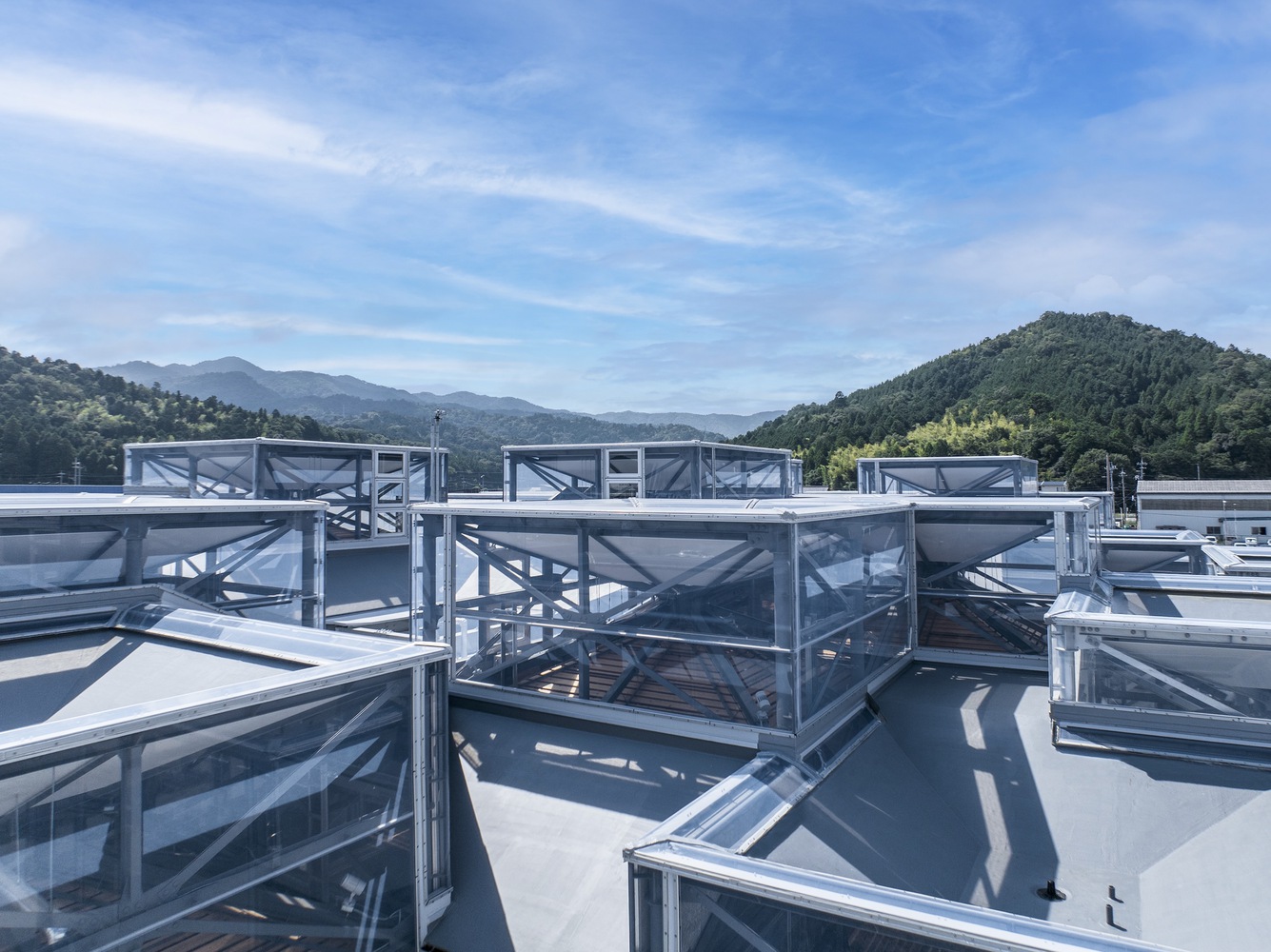 建筑屋顶表层如同“羽绒服”一样,将“羽毛”般的轻薄气团包裹在建筑外壳,并在其中储存能量、使建筑通过其呼吸。屋顶的随机几何纹理共有72 个单元、15 棵树,以及由 ETFE膜材组成的天窗组成。一体式的硬壳“膜”覆盖着整片屋顶表面。这种设计可以使建筑与外界交换能量,并稳定了下层的内部环境。而日光可以通过雪松百叶窗打造的棱镜结构漫射入内部空间,由此让室内环境充满柔和的光线。