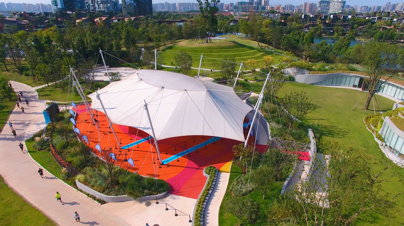 张拉膜结构通常具有简洁的构造,少量元素,以钢制缆绳和框架为主,可选多种不同的膜材料。这些材料不断演进,更加耐用易维护,可承受更大压力。最常使用的是“结构涂层织物”,其内网覆盖有保护膜,满足防水、防火和增加颜色的需求。