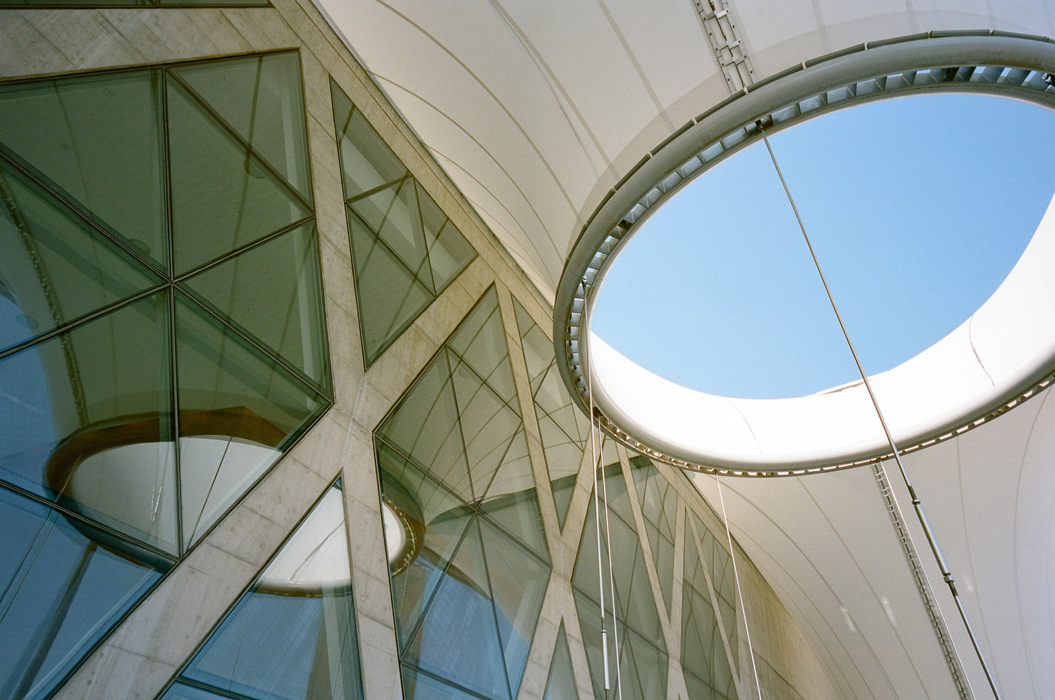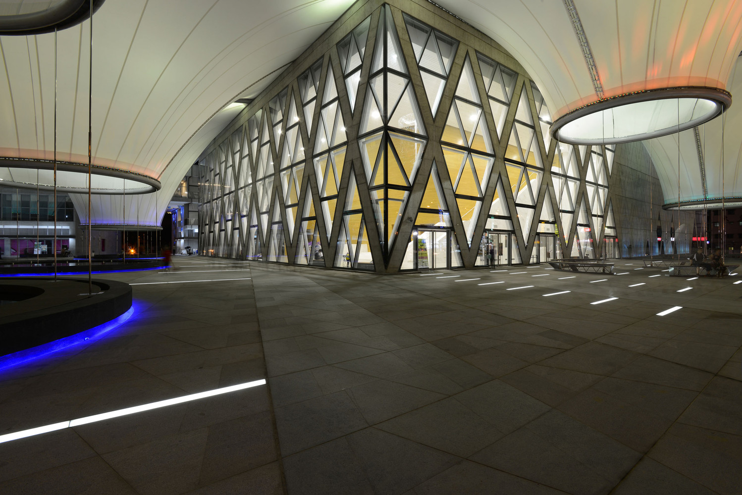 大东艺术中心膜结构建筑的美学特点是轻盈、透明、优美,并注重与自然环境的融合。建筑的外观采用了高透光性的聚碳酸酯纤维膜材料,使建筑物整体看起来透明轻盈,符合现代建筑的简约风格。建筑的结构设计采用了张拉膜膜结构,支持由独特的钢材支架而成的结构体系,使建筑整体造型更加优美。建筑内部还保留了大量绿化景观和自然光线,让人们在其中感受到与自然环境的和谐融合,增加了建筑的亲和力和温度感。