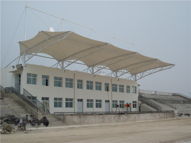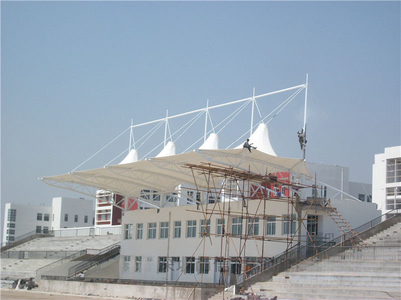 在选择材料时,要基于场地环境和使用条件进行适配。通常采用PTFE膜、PVC 膜材料和 ETFE 膜材料等。材料的厚度和耐用程度必须符合使用需求。然后将相应材料按照设计方案进行加工、裁剪,并固定于支架上。