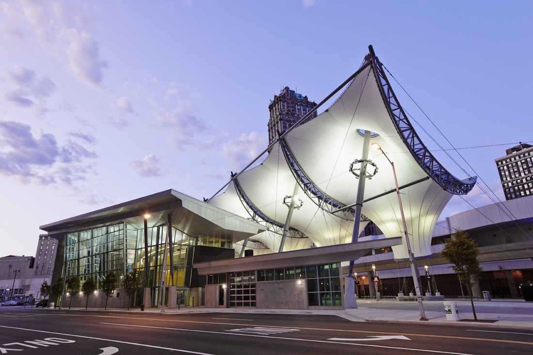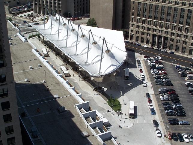 罗莎·帕克斯交通中心由多个大型膜结构组成,它们被连在一起形成一座庞大的膜结构建筑。建筑师们从自然界中吸取灵感,将建筑物的外观与功能完美地融合在一起。整个建筑体系采用了创新的铁制桁架结构,在保持建筑物结构稳定的同时,还最大程度地提高了建筑的外观设计和实用性。