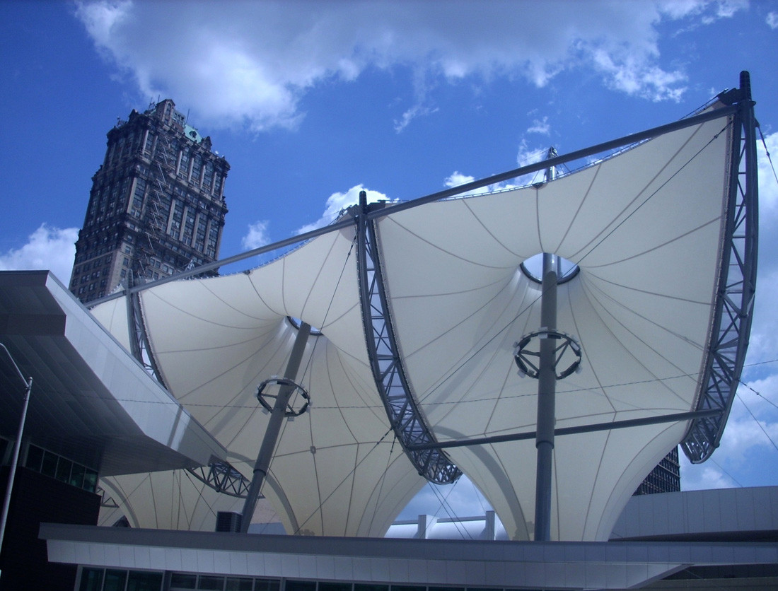 建筑结构:罗莎·帕克斯交通中心膜结构建筑的建筑结构采用轻质、高强度的膜材料,能够承受风吹雨打等自然环境的冲击,保证建筑物的安全性和稳定性。这种膜材料的强度和耐久性比传统建筑材料更高,同时还具备透过性和光线漏射率的特点,供电和通风系统的使用率也会得到提高。