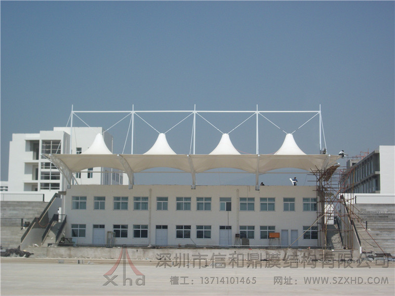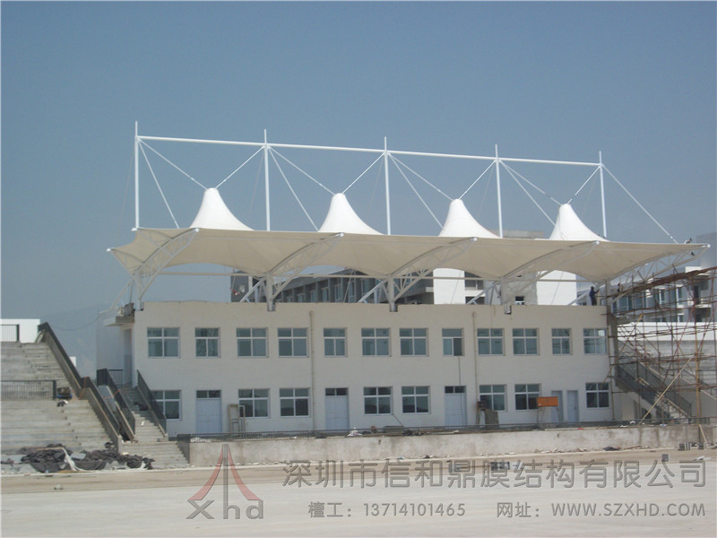 项目名称:临汾新高中体育场主席台膜结构工程工程地点:临汾新高中项目部建设单位:临汾市城建工程有限责任公司膜类型:进口德国米乐膜材料颜色:白色