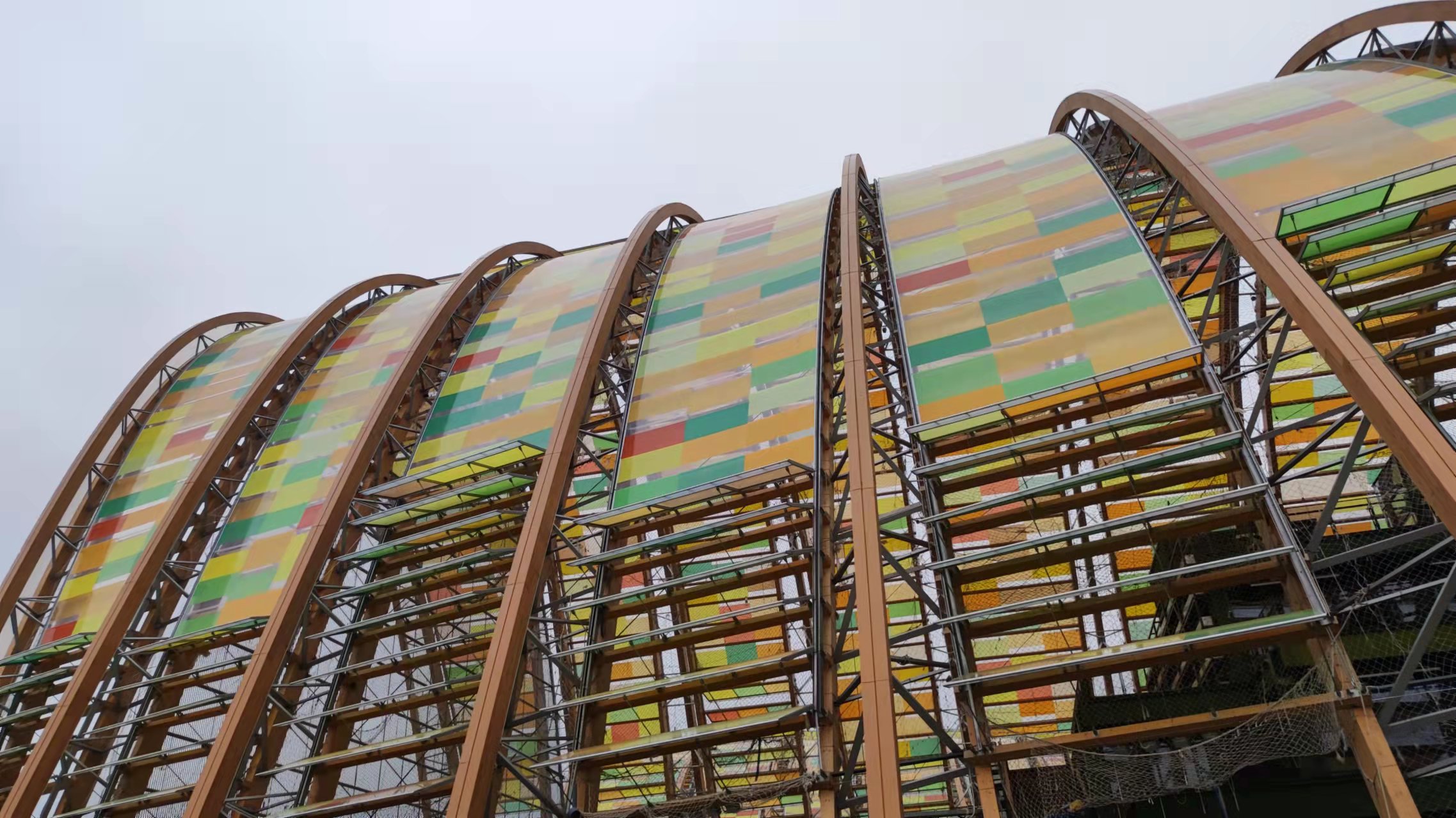 成都天府农博园ETFE膜结构展馆的建筑结构以轻型钢组件为主,结合混凝土地基,整体轻盈柔和。又因其发展用面积超过5000平方米,采用世界首创的钢木混合空腹桁架拱(钢木结构),整体为CNC加工木檩条+ETFE 膜结构体系,进一步提升了其绿色环保性。整栋建筑结构悬挑且构造精巧,使得展馆内部的空间显得格外通透宽敞,在展览布置上具有更大的自由度和创造性。