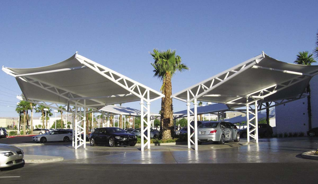 随着膜结构技术的日益成熟,膜结构广泛的应用在各个领域,如景观膜结构、小品膜结构、车棚膜结构、收费站膜结构、遮阳棚等等,而现在车棚遮阳棚应用膜结构不仅有更美观的视觉效果,而且跟传统的车棚相比,更能使之延长其使用寿命,具体有哪些优势呢?下面详细介绍: