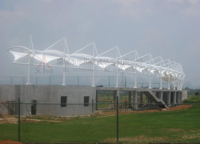 工程膜材:白色PVDF建筑膜材工程概况:膜结构发球台遮阳棚是桂林旅游专科学院的建设项目,满足发球遮阳的需求,根据高尔夫发球台的造型特点和设计需求,在发球台上搭建膜结构遮阳棚,膜结构造型设计采用简约的风格。